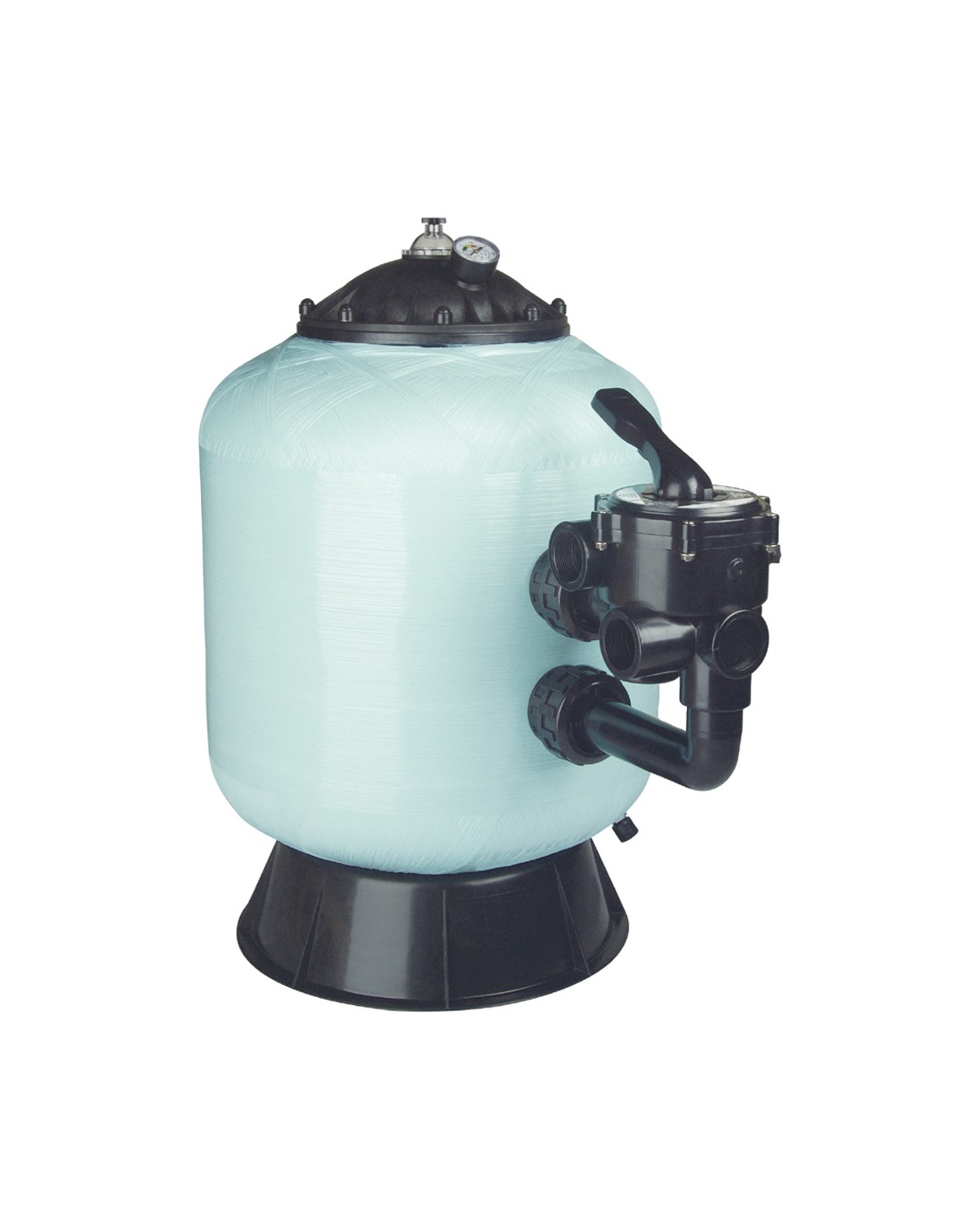Filtro bobinado en resina de poliester y fibra de vidrio, con tapa D-230 mm de cierre por tornillos, inyectada. Equipado con purga de aire y agua manuales y manómetro y válvula selectora lateral. Compatible con arena y vidrio.