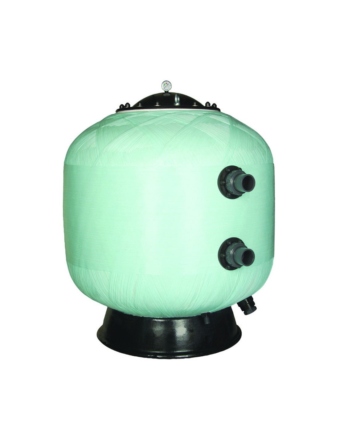 Filtro bobinado en resina de poliester y fibra de vidrio, con tapa D-230 mm de cierre por tornillos, inyectada. Equipado con purga de aire y agua manuales y manómetro y válvula selectora lateral. Compatible con arena y vidrio.