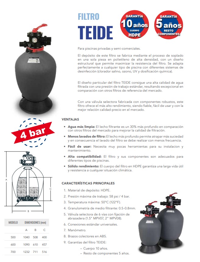 Filtro Teide 500 fabricado con deposito soplado en una sola pieza, lo cual permite maximizar la resistencia del filtro, valvula selectora top (en parte superior) especial para piscinas privadas y semi-publicas.