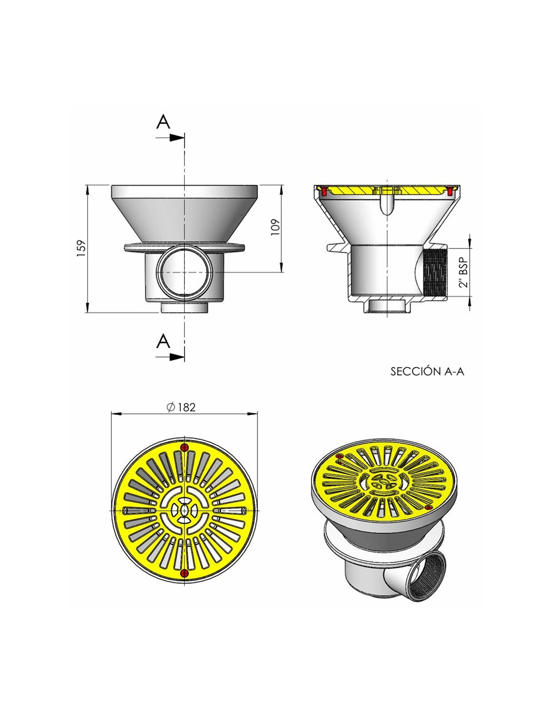 Sumidero circular para piscinas y spas, fabricado cuerpo y rejilla en ABS, fijacion rejilla mediante tornillos.